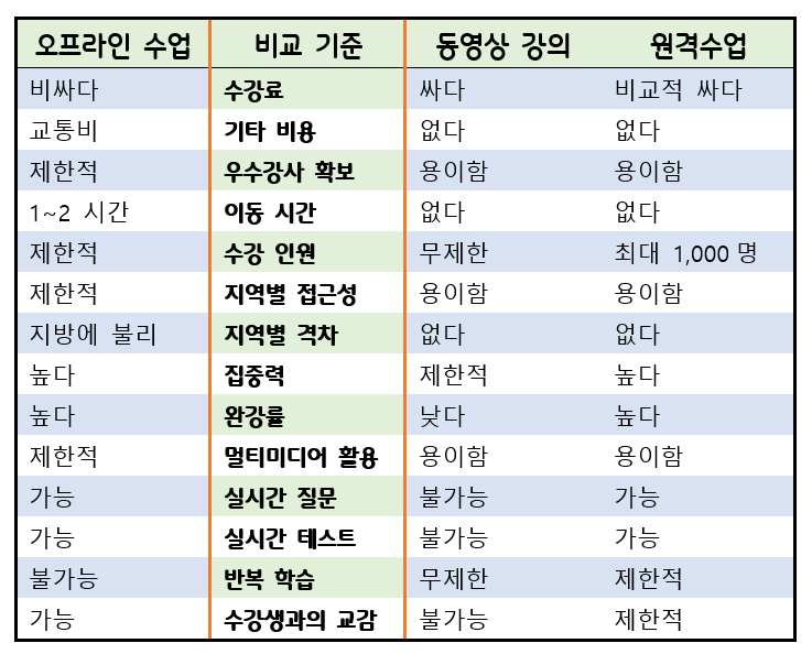녹화된 동영상 강의를 미리 예습하여 정해진 시간에 스마트폰, 태블릿, 또는 PC 로 접속을 하고 동시에 질문을 주고 받는 쌍방향 수업이 이루어집니다. 오프라인 강의실에서 질문하려면 용기가 필요하지만, 원격수업은 누구의 눈치도 볼 필요가 없기 때문에 적극적인 수업 참여가 이루어집니다.
